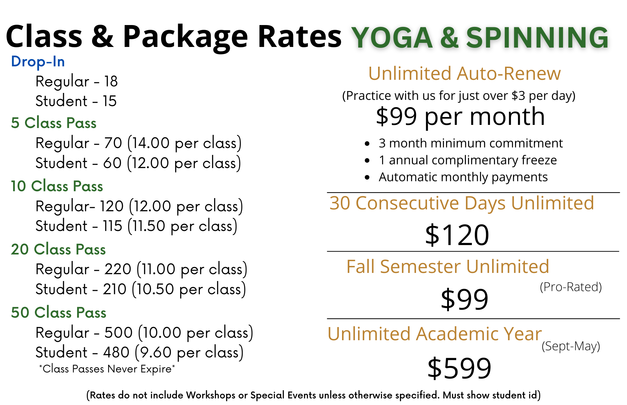 *All packages are good at both YS studios for yoga/spinning/Pilates on our regular weekly schedule.